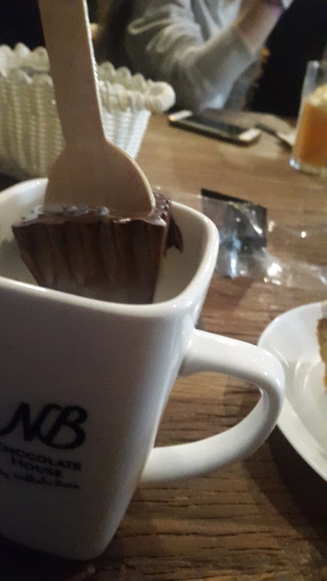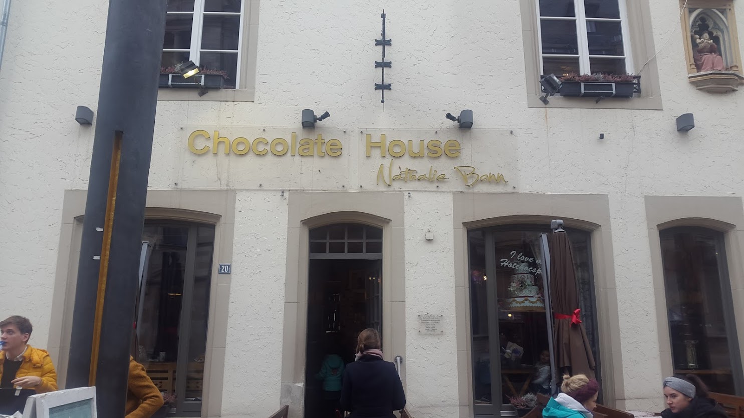 Si daca ajungeti in Luxemburg dragii mei nu ratati Chocolate House, o chestie mica, inghesuita dar cocheta, chiar in fata Palatului Ducal. Loc al decadentei, credeti-ma! Si loc de pierzanie! In galantar stateau labartate torturi care mai de care, toate facute de casa, cu crema, cu bezea, torturi ciocolatoase… Am luat cate o portie si bineinteles nu am ratat nici vestita ciocolata cu lapte ( o cana de lapte fierbinte in care scufunzi o bucatoaie de ciocolata cu adaosuri la alegere – levantica, hot chilli, cocos, caramel… si cate si mai cate… Surpriza a fost tanarul care ne-a servitș romanas de-al nostru care s-a bagat putin in vorba (nu pentru mine ci pentru ochii albastri ai Sabinei cred eu…).