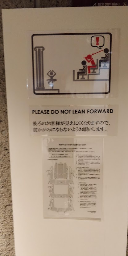 De menționat anunțul făcut înainte de spectacol: să eviți să te apleci înainte, că nu mai vede cel din spate… Am crezut că e o glumă; credeti-mă că nu! Când am încercat să mă aplec am fost corectată imediat de cel din spatele meu. La pauză mi-am cerut scuze și am întrebat cât e permis să mă aplec ca să nu încurc… mi-a arătat: aproximativ 10 grade… La pauză am văzut și afișul.